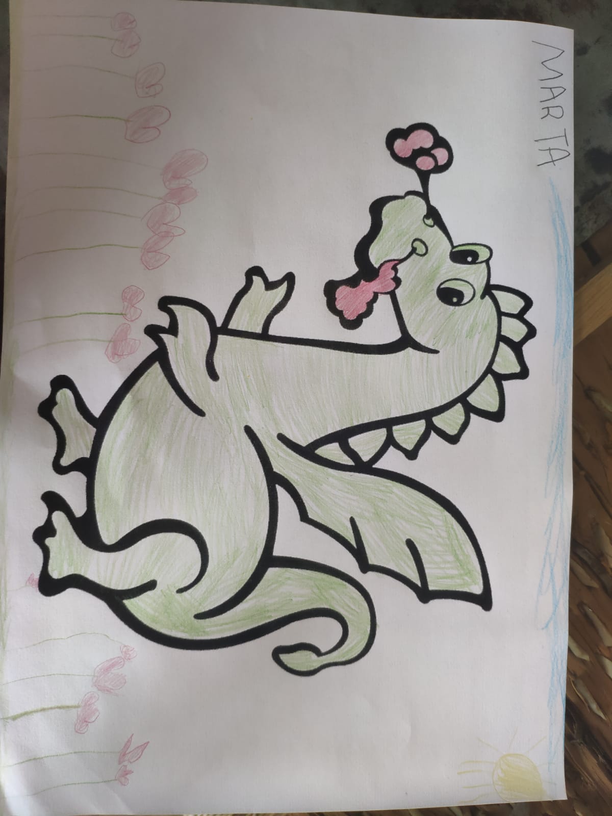 Dragón elaborado con acuarelas y tapones, realizado por Diego.